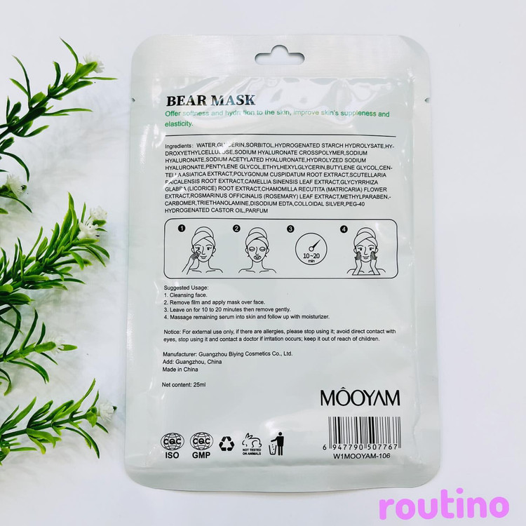 MOOYAM ماسک ورقه ای خرس. اتمام موجودی هیدراته کننده پوست مرطوب کننده و آبرسان ضد چروک و صاف کننده پوست افزایش خاصیت کشسانی پوست بدون تست حیوانی شاداب کننده پوست نرم کننده و مغذی پوست حاوی عصاره گیاهان طبیعی اورجینال اگه داشتی بده